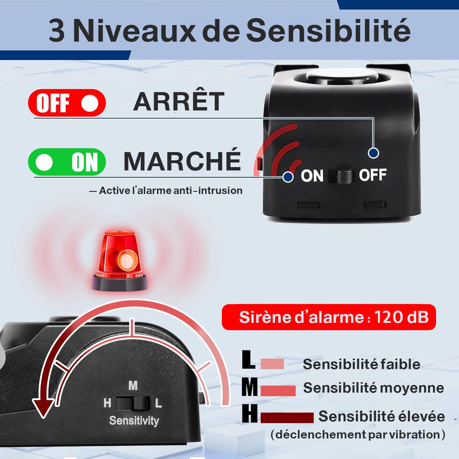 - 🚨 Sirène puissante 120 dB — dissuade immédiatement