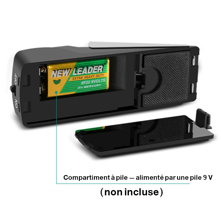 Insérez une pile 9V (non incluse).Ouvrez le compartiment et placez la pile.